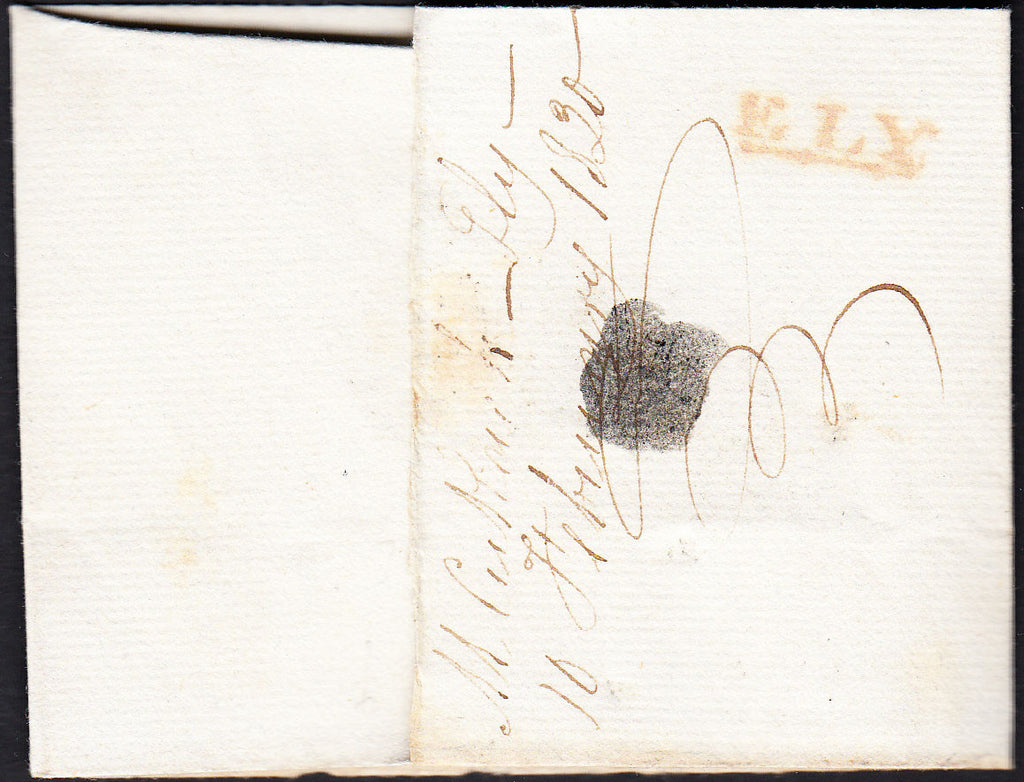 1830 CAMBS/'ELY' HANDSTAMP (CB108) . Wrapper Ely to Hemingford Hunts dated February 10th 1830 with very fine strike ELY straight line mileage mark in red with mileage erased (CB108), postal charge '7'. (Ref 87698).