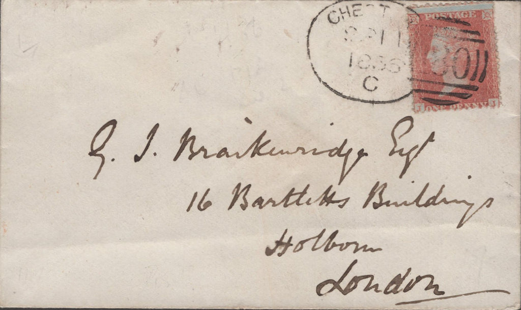 1856 MAIL CHESTER TO LONDON 1D (SG29) 'CHESTER/180' SPOON TYPE 'B' (RA31). 1856 Envelope Chester to London with Die 2 1d pale red-brown on blued paper (SG29) lettered JJ, horizontal crease, tied light strike 'CHESTER/180' spoon type 'B' (RA31) SP 11 1856 code 'C'. (Ref 141366).