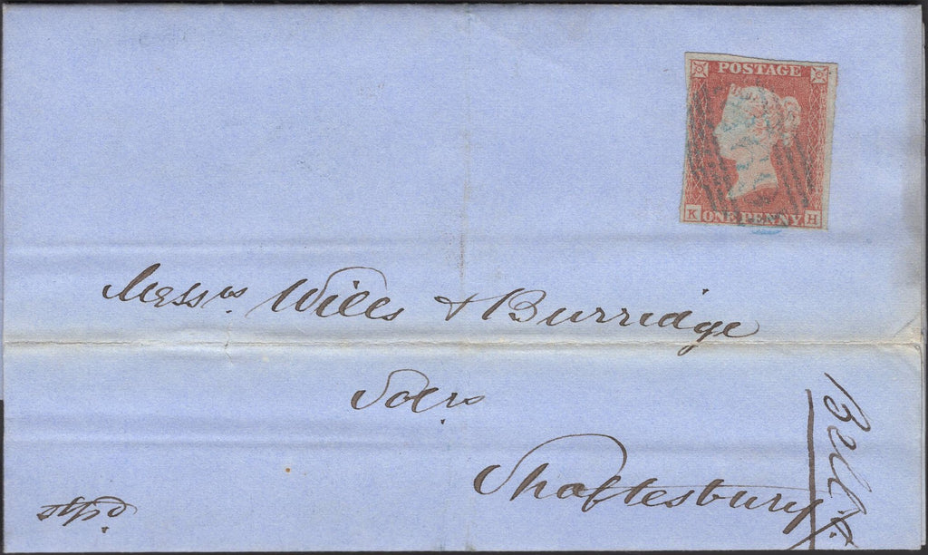 1851 MAIL GILLINGHAM, DORSET TO SHAFTESBURY WITH '693' SHAFTESBURY NUMERAL IN BLUE (SPEC B1xb). Letter from Gillingham dated 16th July 1851 to Shaftesbury with 1d pl.94 (SG8) lettered KH, just touched at left otherwise good margins and tied good strike '693' numeral of Shaftesbury in blue (Spec B1xb). Filing fold clear of stamp and cancellation. On reverse 'SHAFTESBURY' date stamp JY 17 1851 in blue and 'GILLINGHAM' date stamp same day in black. (Ref 135060).