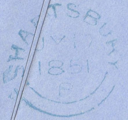 • 135060 1851 MAIL GILLINGHAM, DORSET TO SHAFTESBURY WITH '693' SHAFTESBURY NUMERAL IN BLUE (SPEC B1xb).