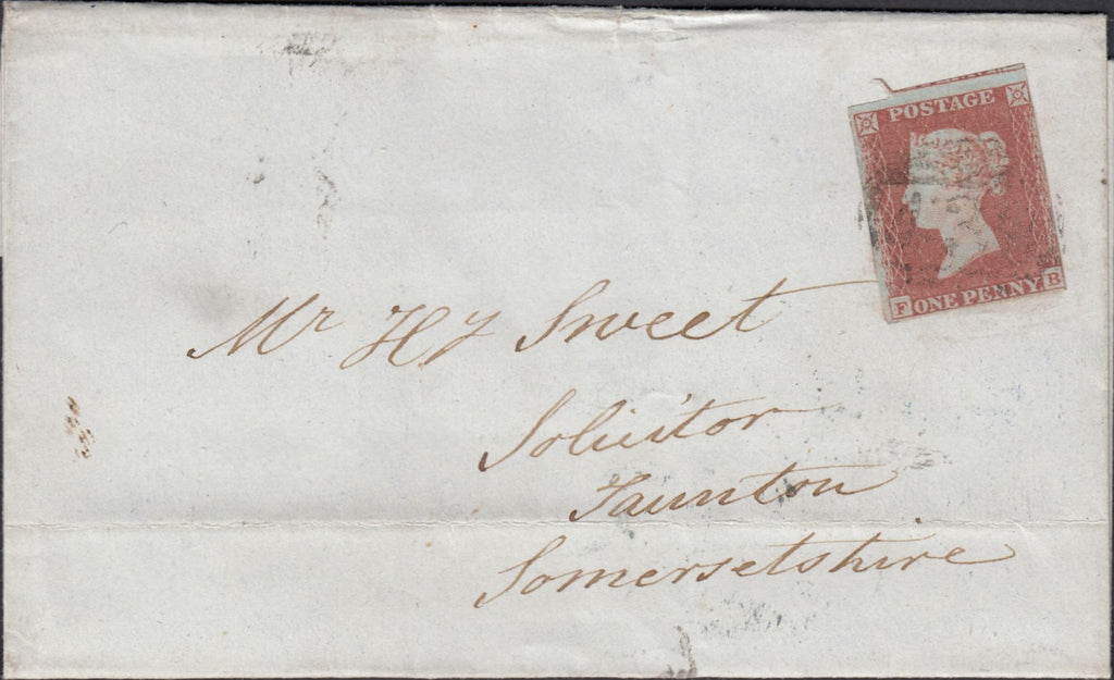 1852 MAIL LAUNCESTON, CORNWALL TO TAUNTON WITH 1D PL.138 (SG8)(FB). Wrapper from Launceston to 'Mr Sweet, Solicitor, Taunton, Somersetshire' with 1d pl.138 (SG8) lettered FB with four close but clear to good margins and tied '439' numeral of Launceston. On reverse 'LAUNCESTON' date stamp NO 4 1852. (Ref 131930).