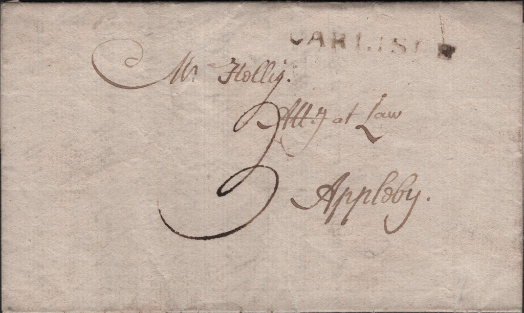 1793 MAIL CARLISLE, CUMBERLAND TO APPLEBY WITH 'CARLISLE' STRAIGHT LINE HAND STAMP (CU119). Fine letter from Carlisle dated 16 Oct 1793 to 'Mr Hollis, Atty at Law, Appleby', charged '3' and on front good to fine strike 'CARLISLE' straight line hand stamp inblack (CU119). (Ref 140971).