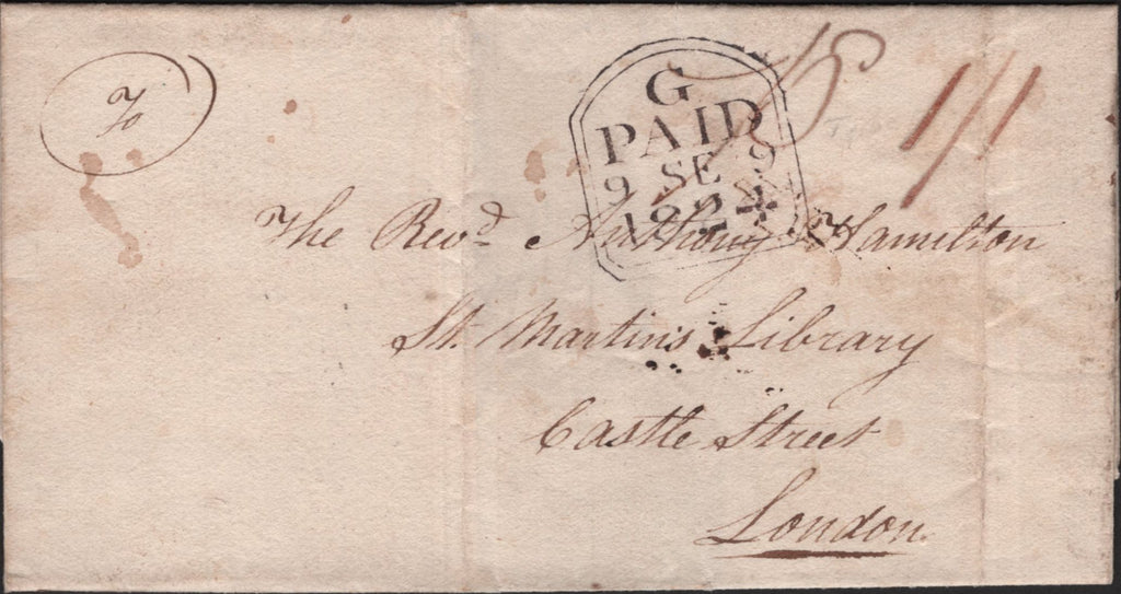 1824 MAIL WIGTON, CUMBERLAND TO LONDON WITH 'WIGTON/309' MILEAGE MARK (CU530). Wrapper from Wigton to 'The Revd Anthony Hamilton, St Martins Library, Castle Street, London', post paid '1/1' and on front London 'PAID' date stamp 9 SE 1824. On reverse very fine strike 'WIGTON/309' mileage mark in black (CU530). (Ref 140973).