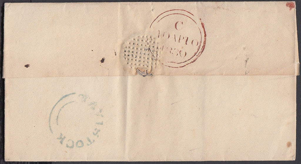 1830 DEVON/'TAVISTOCK' UDC (DN1327). Wrapper Tavistock to London with good strike of the TAVISTOCK udc in blue (DN1327) back stamped London 10 AP 1830. (Ref 67186).