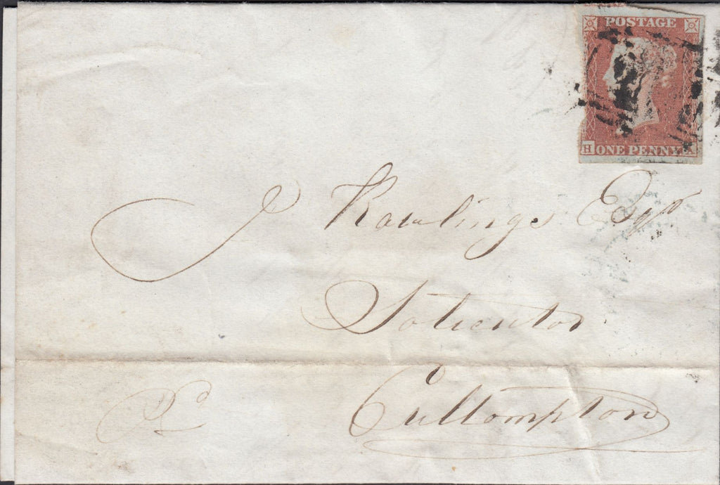1850 MAIL BRADNINCH (DEVON) TO CULLOMPTON 'BRADNINCH' UDC. Letter Bradninch to Cullompton with 1d (SG8) lettered HA, cut into at left otherwise good margins tied indistinct numeral. On reverse fine strike (over flap) 'BRADNINCH' udc in blue-green and CULLOMPTON date stamp JY 5 1850 in blue.  (Ref 76373).