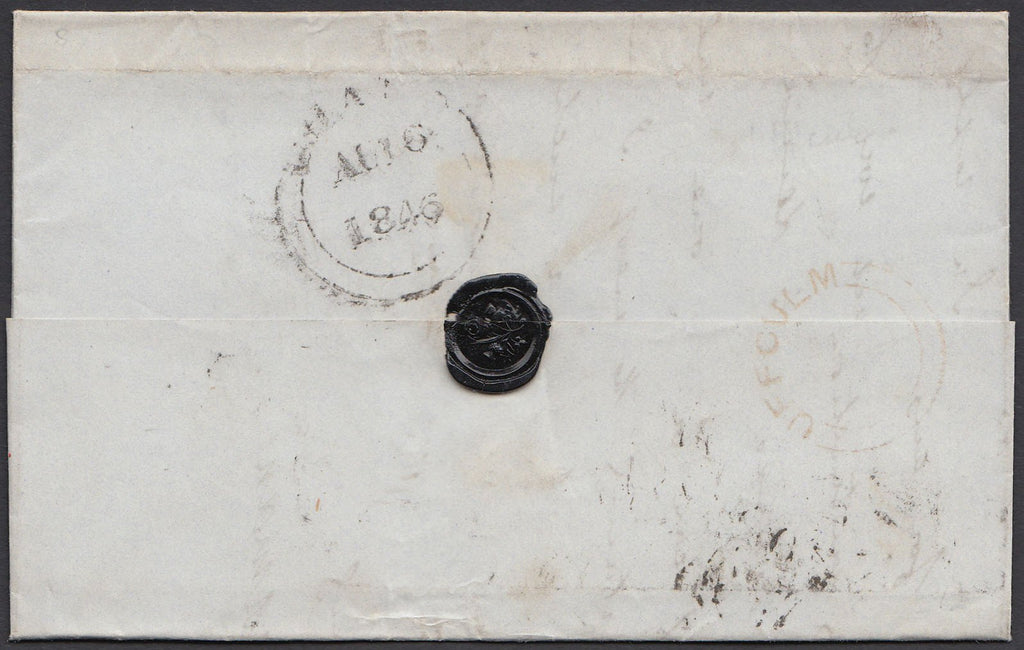 1846 DEVON/'UFFCULM' UDC. 1846 letter Uffculm to Chard with 1d (SG8) lettered JK, touched at foot at and filing fold affects, tied '214' numeral of Cullompton, alongside CULLOMPTON date stamp AU 15 1846. On reverse fine strike 'UFFCULM' udc in green. (Ref 76383).