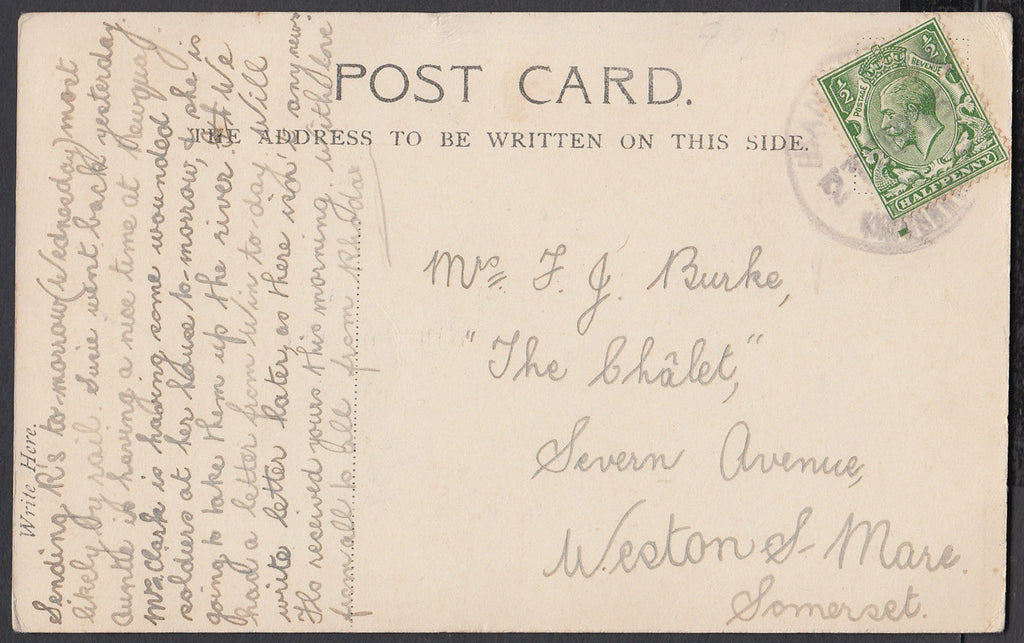 DEVON. 1915 post card of Bantham to Weston Super Mare with KGV ½d tied "BANTHAM/KINGSBRIDGE" rubber handstamp 21.SEP.15. (Ref 76519).