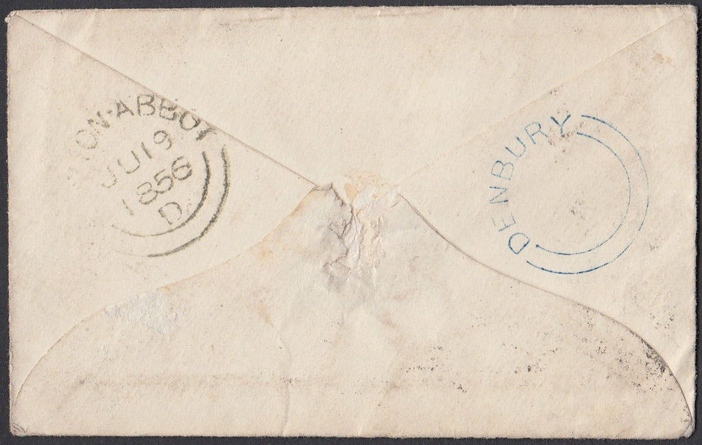 1856 DEVON/'DENBURY' UDC. Envelope Newton Abbot to Tiverton with Die 2 1d red-brown on blued paper (SG29) lettered BC, centred low and several short perfs tied "567" numeral of Newton Abbot. On reverse fine "DENBURY" udc in blue and NEWTON-ABBOT date stamp JU 19 1856 in green. (Ref 76764).