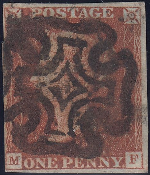 1843 MALTESE CROSS WITH DOT IN CENTRE/PL.40 (SG8)(MF). Good used 1843 1d pl.40 (SG8) lettered MF with four close but clear to fine margins, cancelled good but slightly heavy strike black Maltese Cross with DOT IN CENTRE (nail head?). (Ref 120364).