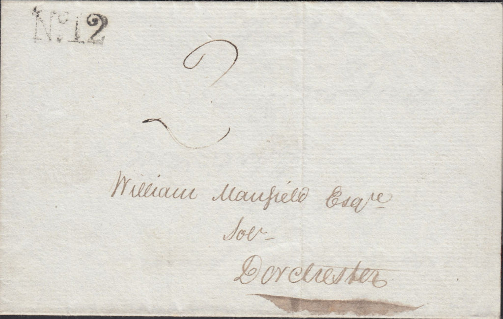 1835 DORSET/"DORCHESTER PENNY POST" (DT247). Letter Weymouth to Dorchester dated 6 July 1835, charged "2" and on front very fine strike unframed "No.12" local receiver's hand stamp in black of Upwey. On reverse good strike (over flap) "Dorchester/P.y Post" hand stamp in black (DT247). (Ref 113012).
