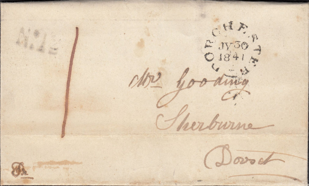 1841 DORSET/DORCHESTER PENNY POST. Letter Broadway to Sherborne Dorset dated July 20 (1841), post paid "1" and on front good strike unframed "No.12" receiver's hand stamp of Upwey in black and fine strike DORCHESTER date stamp JY 30 1841 (DT234). On reverse SHERBORNE date stamp JY 31 1841 (DT519). Minor soiling. (Ref 113015).