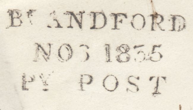 1835 DORSET/"BLANDFORD PENNY POST" (DT56). Wrapper Blandford to "Mefsrs Rothschild Bankers London", charged "10" and on front fair strike boxed "No.2" receiver's hand stamp of Durweston. On reverse fine strike "BLANDFORD/NO 6 1835/PY POST" hand stamp in black (DT56). (Ref 113038).
