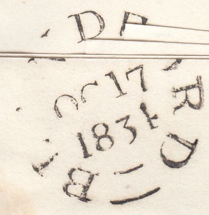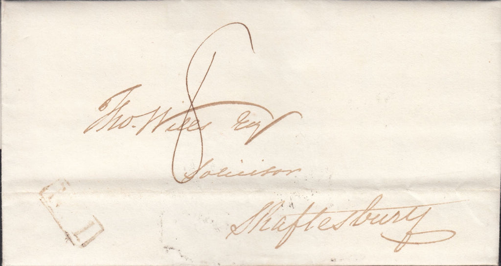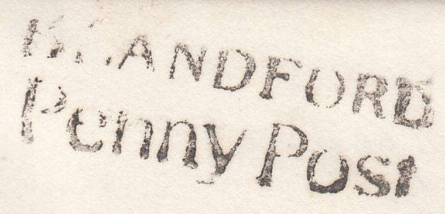 1834 DORSET/'BLANDFORD PENNY POST' (DT54). Fine letter Sturminster to Shaftesbury dated 17 Oct 1834 and charged '8'. On reverse fine to very fine strike 'BLANDFORD/Penny Post' hand stamp in black (DT54) and BLANDFORD date stamp OC 17 1834. On front light strike boxed 'No.1' receivers hand stamp of Sturminster Newton. (Ref 117197).