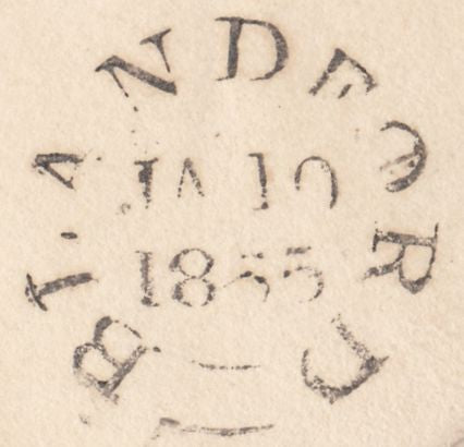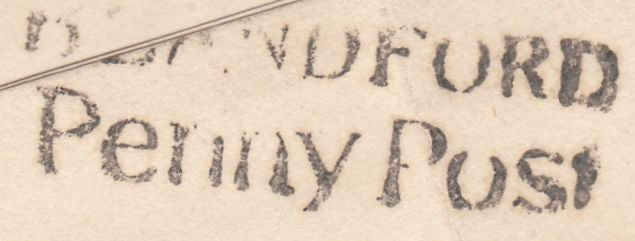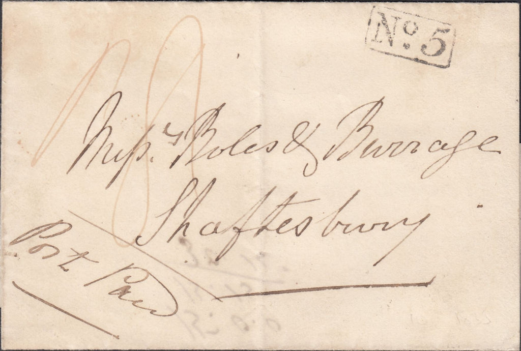 1835 DORSET/'BLANDFORD PENNY POST' HAND STAMP (DT54). Letter Blandford to Shaftesbury with post paid '8' and on front superb strike boxed 'No.5' receivers hand stamp of Almer. On reverse fine strike 'BLANDFORD/Penny Post' hand stamp in black (DT54) and BLANDFORD date stamp JA 10 1835. (Ref 117198).
