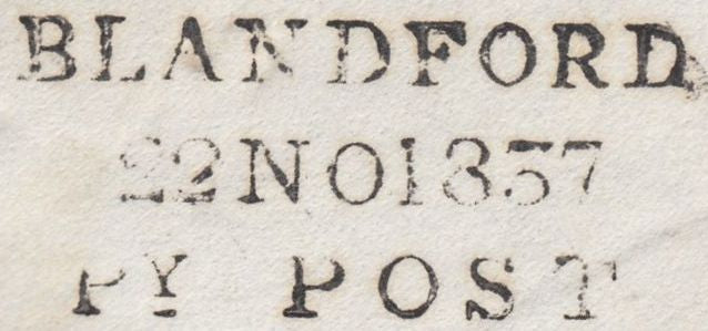 1837 DORSET/'BLANDFORD PENNY POST' HAND STAMP (DT56). Fine letter Bere Regis to Shaftesbury, post paid '8' and on front very fine strike unframed 'No.6' receivers hand stamp of Bere Regis in black. On reverse good strike 'BLANDFORD/22NO1837/PY POST' hand stamp in black (DT56). (Ref 117200).