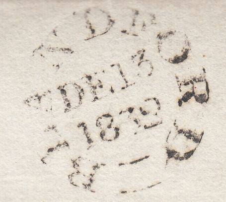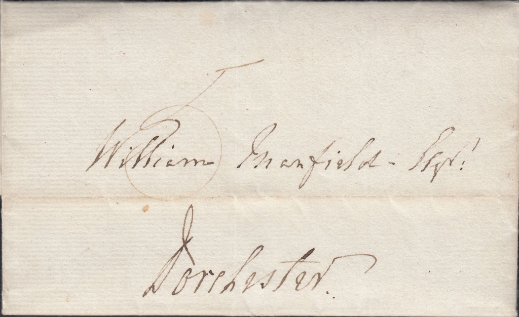1832 DORSET/'TOO LATE' ITALIC STYLE HAND STAMP TYPE A (DT63). Fine letter Iwerne to 'William Manfield Esqr Dorchester' dated 12 Dec 1832, charged '5', on reverse fine strike boxed 'Too Late' italic style hand stamp type A (DT63) in black and BLANDFORD date stamp DE 13 1832. (Ref 118042).