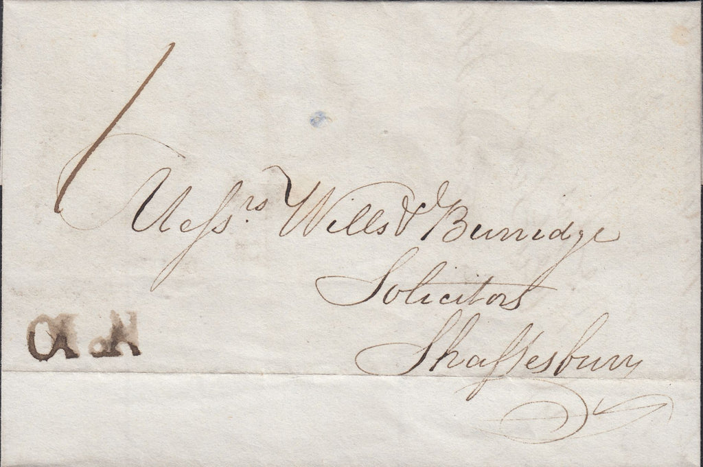 1838 DORSET/SHAFTESBURY PENNY POST. Letter Milborne Port to 'Mefsrs Wills and Burridge Solicitors Shaftesbury' dated 1st Jany 1838, charged '1' and on front fine strike unframed 'No.10' receiver's house hand stamp of Milborne Port. On reverse SHAFTESBURY date stamp JA 1 1838. (Ref 119601).