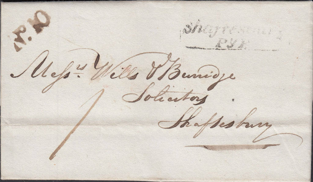 1838 DORSET/'SHAFTESBURY PENNY POST' (DT45). Fine letter Milborne Port to 'Mefsrs Wills and Burridge Solicitors Shaftesbury' dated 9th June 1838 and charged '1'. On front part strike boxed 'Shaftesbury/Py P.' hand stamp in black (DT45) and fine strike unframed 'No.10' receiver's house hand stamp of Milborne Port in black. (Ref 119602).