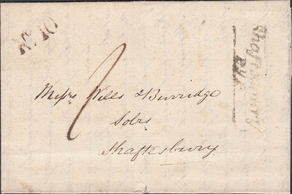 1839 DORSET/'SHAFTESBURY PENNY POST' (DT461). Letter Milborne Port to 'Mefsrs Wills and Burridge Solrs Shaftesbury' dated Aug 18 1839 and charged '1'. On front fair strike boxed 'Shaftesbury/Py P.' hand stamp in black (DT461) and good strike unframed 'No.10' receiving house hand stamp of Milborne Port. (Ref 119605).