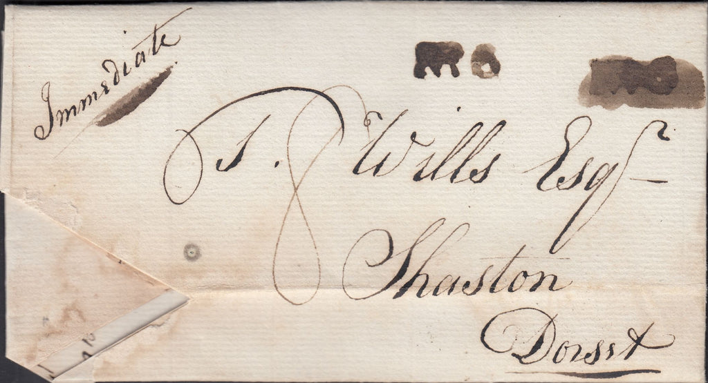 1832 DORSET/'BLANDFORD PENNY POST' HAND STAMP (DT54). Letter from Bere Regis to 'J Wills Esq Shaston Dorset' part wrapper missing, dated August 14th 1832 and charged '8'. On front overinked strikes of the unframed 'No.6' receiving house hand stamp of Bere Regis, on reverse good strike 'BLANDFORD/Penny Post' hand stamp in black (DT54). (Ref 119618).