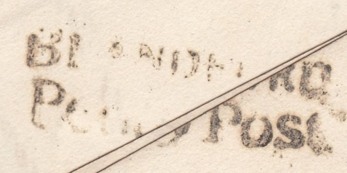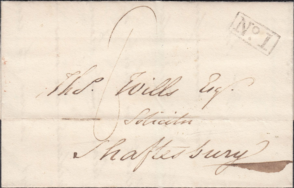 1832 DORSET/'BLANDFORD PENNY POST' HAND STAMP (DT54). Letter Sturminster Newton to 'Thos. Wills Esq Solicitor Shaftesbury' dated 26 June 1832 and charged '8'. On front very fine strike boxed 'No.1' receiving house hand stamp of Sturminster Newton, on reverse fair strike over flap 'BLANDFORD/Penny Post' hand stamp in black (DT54). (Ref 119623).