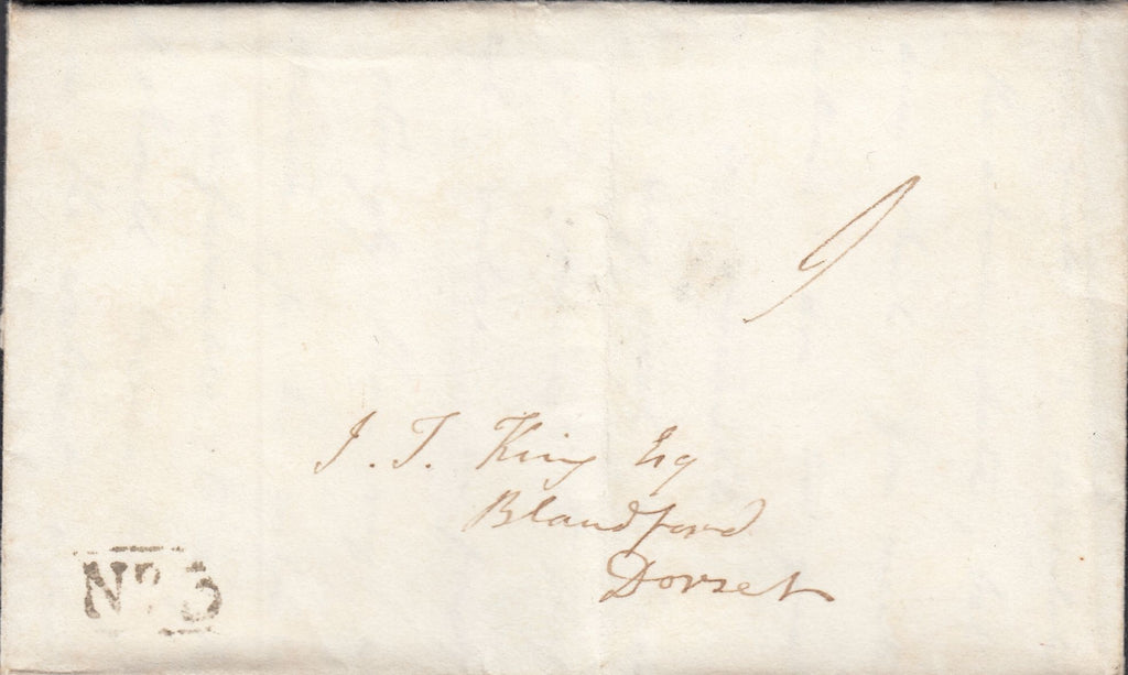 1838 DORSET/'SHERBORNE PENNY POST' HAND STAMP (DT525). Entire Queen Camel Sherborne Dorset to 'J. F. King Esq Blandford Dorset' dated 9th July 1838, charged '6' and on front fair strike boxed 'No.3' receiving house hand stamp of Queen Camel. On reverse light strike 'SHERBORNE/Penny Post' hand stamp in black (DT525). Letter references the livings at Marston and Ashington. (Ref 119627).