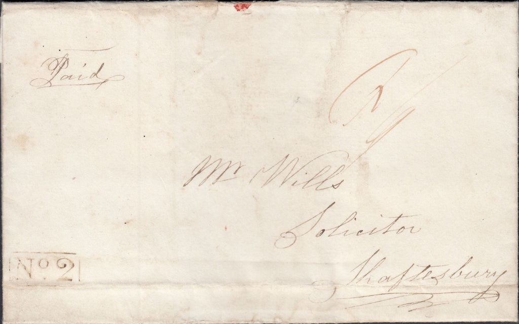 1835 DORSET/'SHERBORNE PENNY POST' HAND STAMP (DT525). Letter Compton to 'Mr Wills Solicitor Shaftesbury' dated 28 Dec 1835, postage paid and on front very fine strike boxed 'No.2' receiving house hand stamp of Compton. On reverse light strike 'SHERBORNE/Penny Post' hand stamp in black (DT525). (Ref 119630).