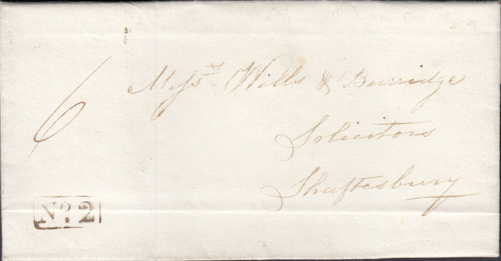 1838 DORSET/'SHERBORNE PENNY POST' (DT525). Fine letter Nether Compton to 'Mefsrs Wills and Burridge Solicitors Shaftesbury' dated 9th March 1838 and charged '6'. On front very fine strike boxed 'No.2' receiving house hand stamp of Nether Compton, filing fold affects. On reverse good strike over fold of 'SHERBORNE/Penny Post' hand stamp in black (DT525) and SHERBORNE date stamp MA 10 1838. (Ref 119638).