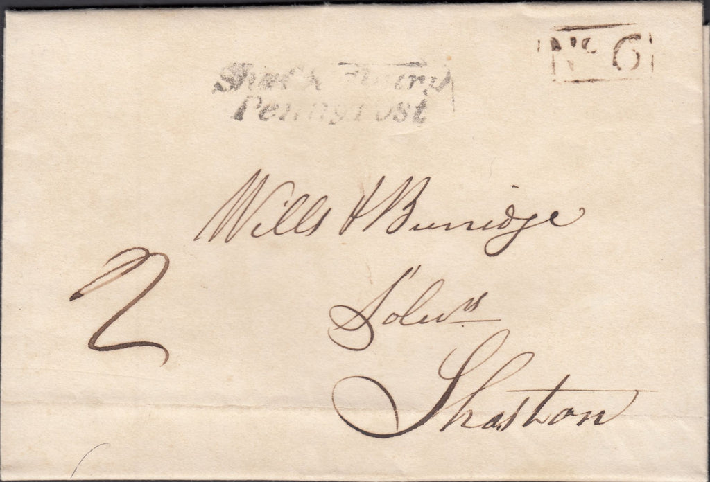 1833 DORSET/'SHAFTESBURY PENNY POST' HAND STAMP (DT458). Fine letter Marnhull to 'Wills and Burridge Solr. Shaston' (Shaftesbury) dated 14th October 1833 and charged '2'. On front light strike boxed 'Shaftesbury/Penny Post' hand stamp in black (DT458) and good strike boxed 'No.6' receiving house hand stamp of Marnhull in black. (Ref 119660).