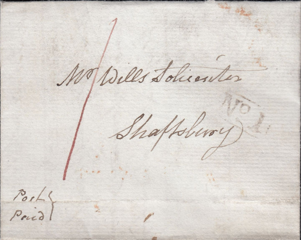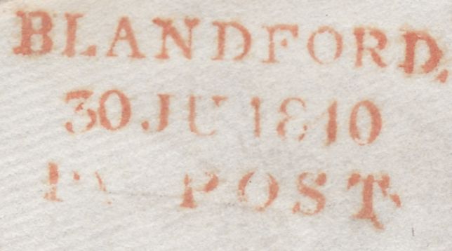 1840 DORSET/'BLANDFORD PENNY POST' HAND STAMP (DT56). Letter Sturminster to 'Mr Wills Solicitor Shaftesbury' dated June 30 1840 and post paid '1'. On front good to fine strike boxed 'No.1' receiving house hand stamp of Sturminster Newton and on reverse fine strike 'BLANDFORD/30 JU 1840/PY POST' hand stamp in red (DT56). (Ref 119685).