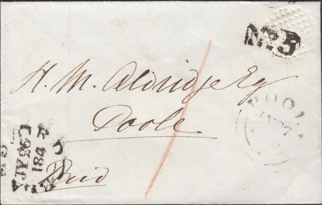 1846 DORSET/BLANDFORD PENNY POST. Envelope Blandford to 'H M Aldridge Esq Poole' post paid '1', on front fine strike boxed 'No.5' receiving house hand stamp of Almer, under the Blandford Penny Post, and BLANDFORD date stamp JY 26 1846. (Ref 119696).