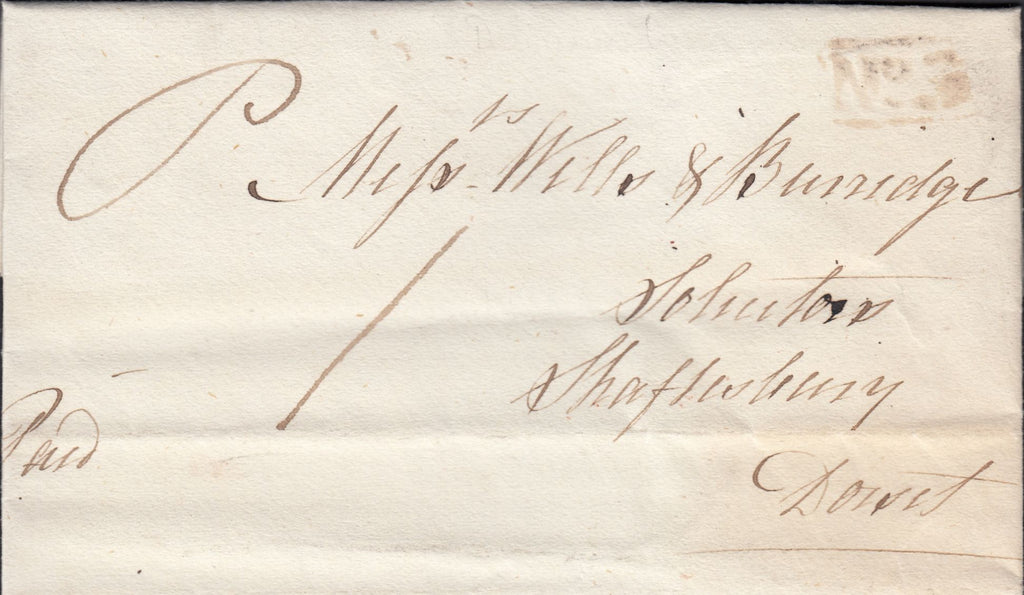 1840 DORSET/'BLANDFORD PENNY POST' HAND STAMP (DT56). Letter Durweston to 'Mefsrs Wills and Burridge Solicitors Shaftesbury Dorset' dated 28 Oct 1840 and post paid '1', slight creasing. On front good strike boxed 'No.3' receiving house hand stamp of Durweston and on reverse good strike 'BLANDFORD/28 OC 1840/PY POST' hand stamp in red (DT56). (Ref 119720).