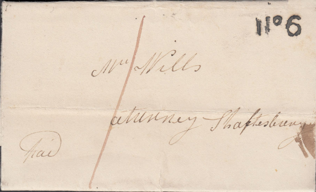 1843 DORSET/'BLANDFORD PENNY POST' HAND STAMP (DT56). Letter Bere Regis to 'Mr Wills aturney Shaftesbury' dated 19 Dec 1843 and post paid '1'. On front very fine strike unframed 'No.6' receiving house hand stamp of Bere Regis in black, on reverse good strike 'BLANDFORD/19 DE 1843/PY POST' hand stamp in black (DT56) and SHAFTESBURY date stamp DE 20 1843. (Ref 119722).