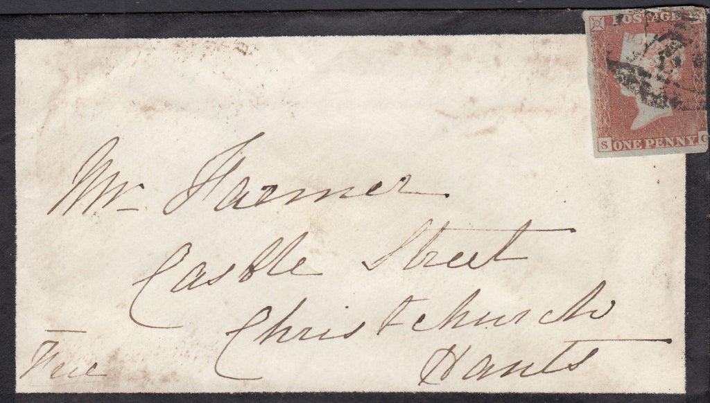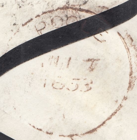 1853 DORSET/'POOLE' SKELETON STYLE DATE STAMP (32MM).  Mourning envelope Poole to 'Mr Farmer Castle Street Christchurch Hants' with 1d (SG8) lettered SC, cut into and cancelled '624' numeral of Poole. On reverse good strike of the very scarce 'POOLE' skeleton style date stamp (32mm) in black JU 7 1853. (Ref 119795).