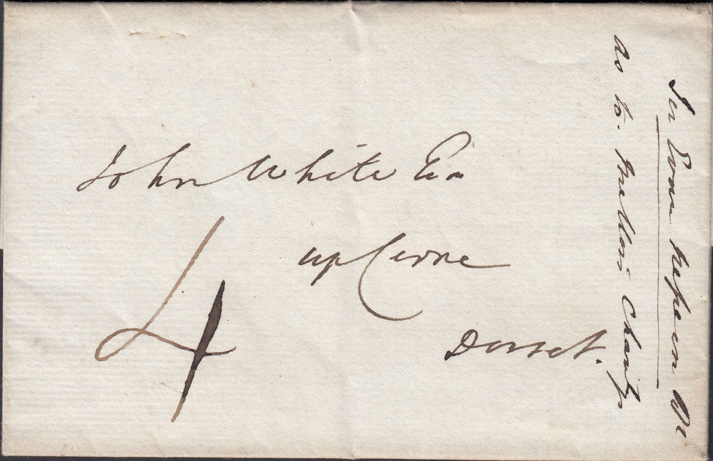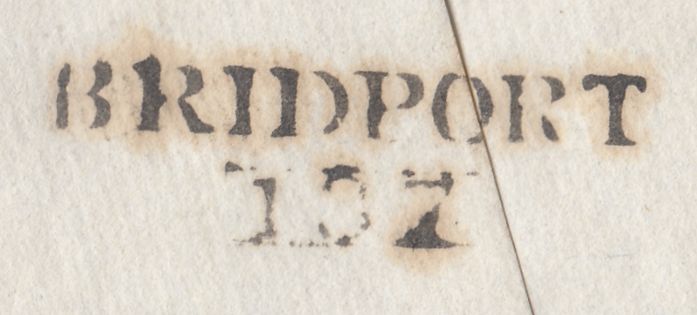 DORSET/'BRIDPORT 137' MILEAGE MARK ON COVER (USED 1824-1829). Fine undated letter Bridport to 'John White Esq Cerne Dorset', charged '4' and on reverse (over flap) very fine strike 'BRIDPORT/137' mileage mark in black, recorded in use 1824-1829. (Ref 119819).