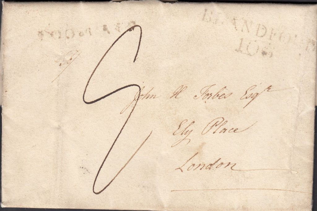1818 MAIL SPETISBURY (DORSET) TO LONDON. Letter Spetisbury to 'John H Forbes Esqre Ely Place London' dated Jan 22 1818 and charged '9'. On front fair strike 'BLANDFORD/108' mileage mark in black (DT41) and faint strike of the scarce 'TWO.LATE' hand stamp of Blandford (DT61) in black. (Ref 119829).