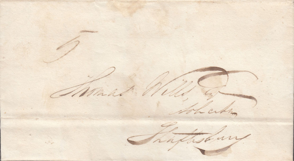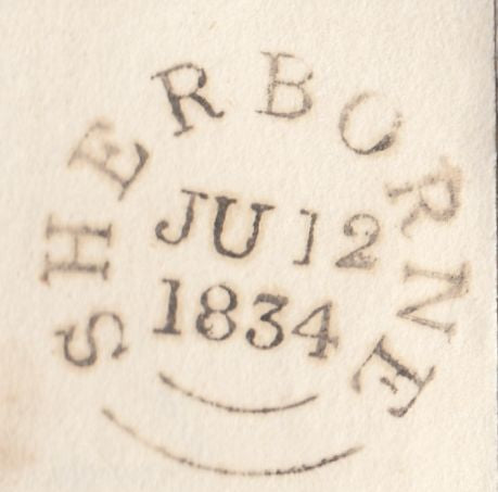 1834 MAIL SHERBORNE TO SHAFTESBURY. Fine letter from Sherborne to 'Thomas Wills Esq Solicitor Shaftesbury' dated June 12 1834 and charged '5'. On reverse superb strike SHERBORNE date stamp (DT519) JU 12 1834. (Ref 119836).