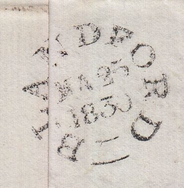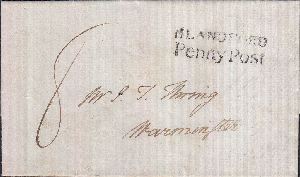 1830 MAIL BLANDFORD TO WARMINSTER WITH 'BLANDFORD/PENNY POST' HAND STAMP (DT54). Letter from Fifehead in Dorset to Warminster dated 23rd March 1830 and charged '8'. On front fine to very fine strike 'BLANDFORD/Penny Post' hand stamp in black (DT54) and on reverse BLANDFORD date stamp MA 23 1830. (Ref 129181).