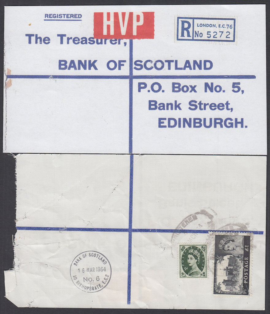 1964 HIGH VALUE PACKET SERVICE/£1 CASTLE ISSUE. Linen parcel tag (slight creasing and very small part missing) sent registered mail with red "HVP" label with 9d Wilding and £1 Castle from London to "BANK OF SCOTLAND...EDINBURGH" cancelled "REGISTERED/ 16 MCH 64" oval datestamps with "BANK OF SCOTLAND" receivers datestamp same day. £1 Castle corner faults but scarce commercial usage of this stamp. (Ref 77642).