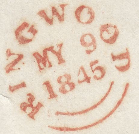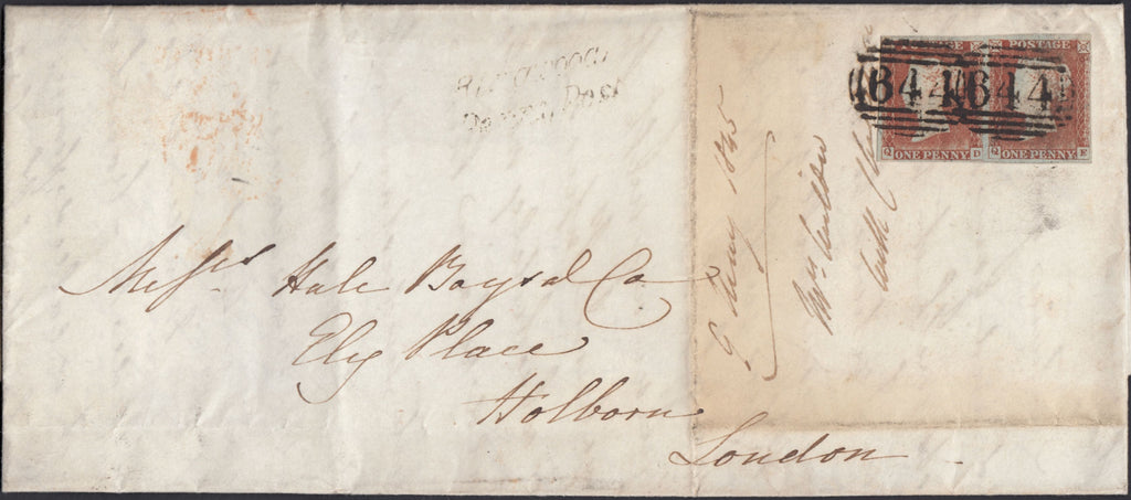 1845 MAIL RINGWOOD TO LONDON WITH 'RINGWOOD/PENNY POST' HAND STAMP (HA1122). Larger wrapper from Winkton, Ringwood to Holborn London, some soiling and creasing, with pair of 1d (SG9) lettered QD QE with four close but clear to fine margins, tied '644' numerals of Ringwood. On front light strike 'Ringwood/Penny Post' hand stamp in black (HA1122). On reverse RINGWOOD date stamp MY 9 1845. (Ref 125140).