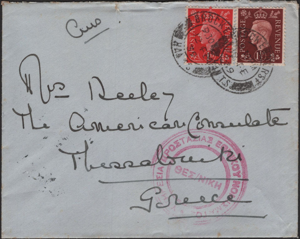 1939 SURFACE MAIL BROCKENHURST, HANTS TO THESSALONIKA, GREECE WITH KGVI ISSUES. Envelope sent surface mail from Brockenhurst to Thessalonika, Greece with KGVI 1d scarlet (SG463) and 1½d red-brown (SG464) cancelled 'BROCKENHURST/HANTS' date stamp 12 FE 39. On reverse Greek receiver. Unusual destination. (Ref 140065).