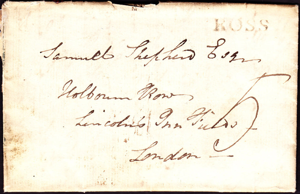 1796 HEREFORDSHIRE/'ROSS' HAND STAMP (HF372). Entire, some faults, Ross to London, dated 12 Jan 1796, charged '5', on front fine strike 'ROSS' hand stamp in black (HF372). (Ref 41130).