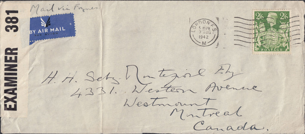 1942 MAIL LONDON TO MONTREAL CANADA KGVI 2/6 YELLOW-GREEN (SG476b). Fine envelope (230 x 101) London to Westmount Montreal Canada with fine 2/6 yellow-green (SG476b) cancelled LONDON 7 AUG 1942. Censor label at left. (Ref 120860).
