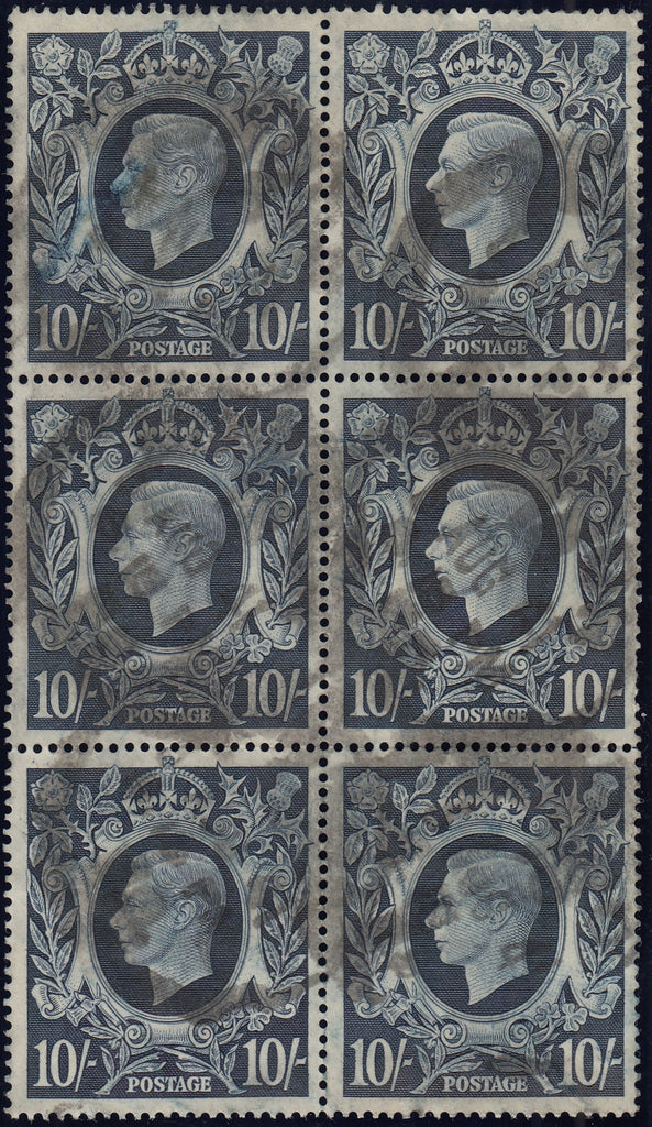 1939 10S DARK BLUE (SG478) USED BLOCK OF SIX WITH INTER-STAMP MARK. Good used block of six 1939 10s dark blue (SG478), slight creasing and heavier cancellation August 1941, block in state two of the plate. Rows 1-3, stamps 3/7 and 3/8 with inter-stamp mark. (Ref 134090).