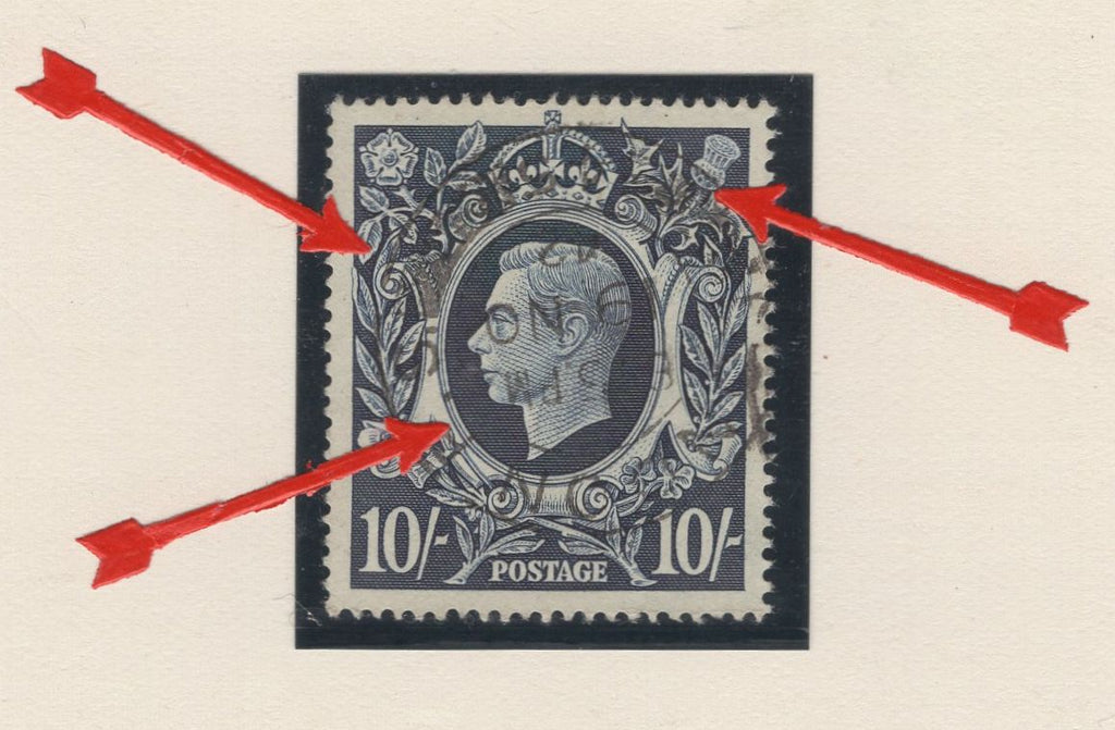 1939 10S DARK BLUE (SG478) USED WITH RE-ENTRY. Fine used 1939 10s dark blue (SG478) showing re-entry marks at three points of design, ex R C Alcock who incorrectly designates it as the Ekstein re-entry, cancelled 'LONDON' 19 NO 42 and presumably from state three of the plate after all impressions had been re-entered. (Ref 134095).
