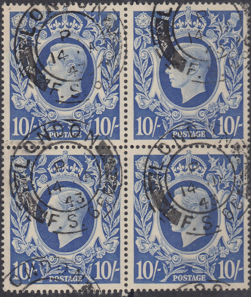 1942 10S ULTRAMARINE (SG478b) VERY FINE USED BLOCK OF FOUR. A very fine used block of four 1942 10s ultramarine (SG478b) with 'LONDON' cancellations 14 JA 43. (Ref 136241).