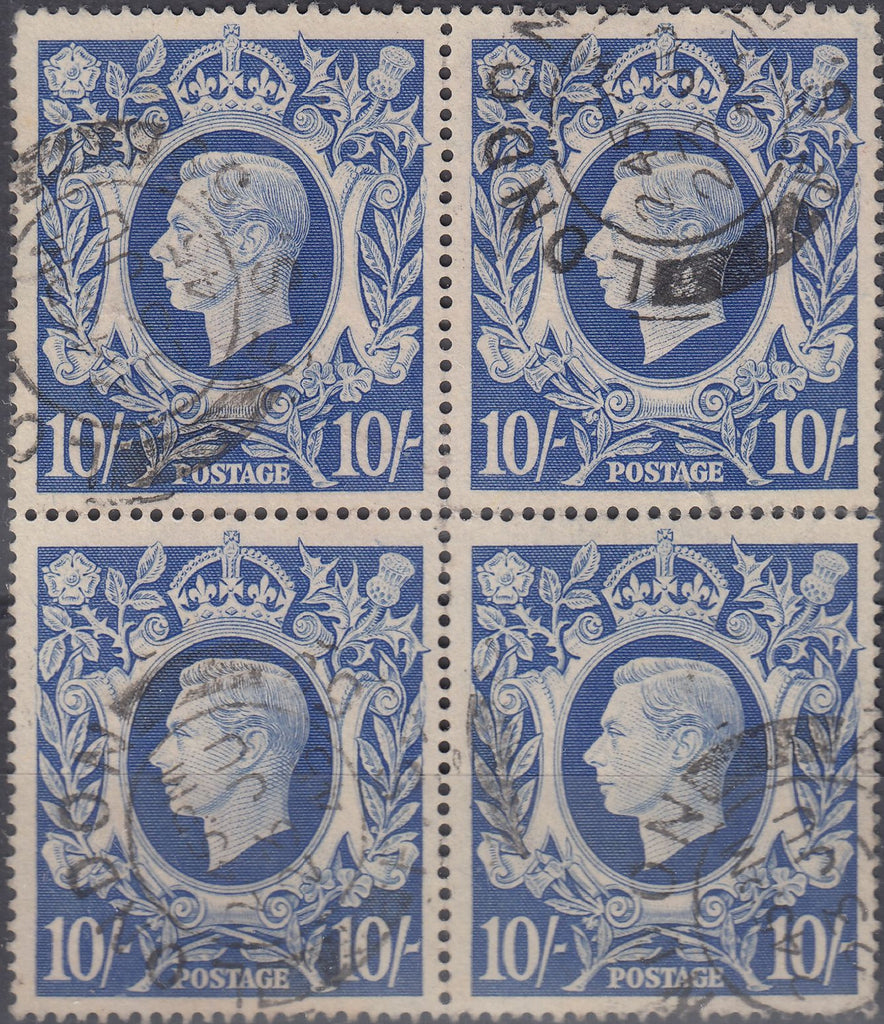 1942 10S ULTRAMARINE (SG478b) VERY FINE USED BLOCK OF FOUR. A very fine used block of four 1942 10s ultramarine (SG478b) with fine 'LONDON' cancellations 23 JU 45. (Ref 136242).
