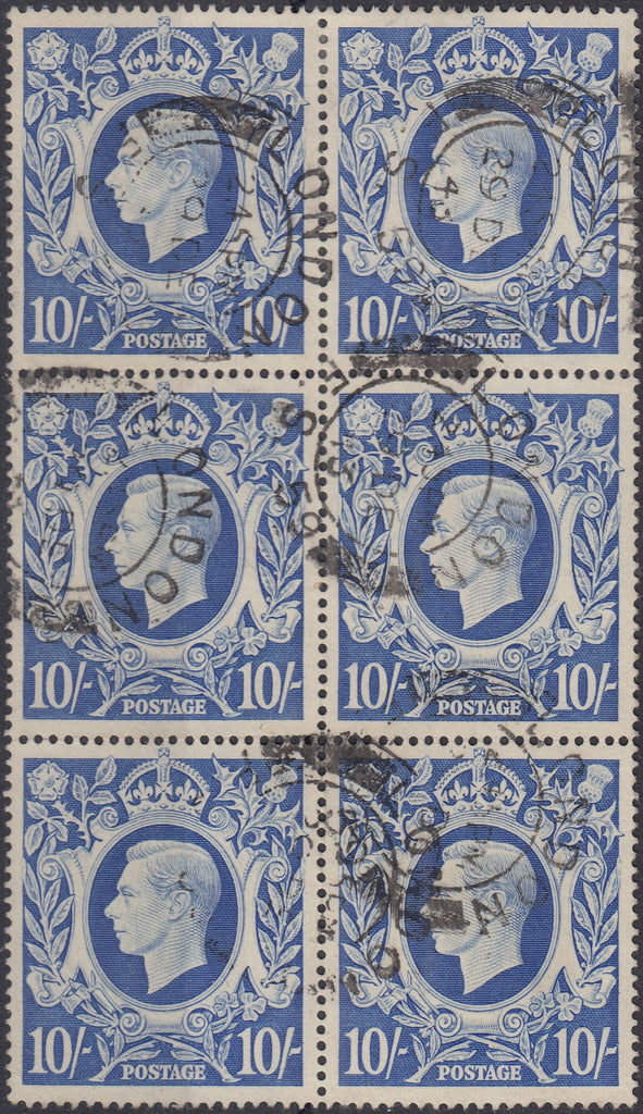 1942 10S ULTRAMARINE (SG478b) VERY FINE USED BLOCK OF SIX. A very fine used block of six 1942 10s ultramarine (SG478b) with 'LONDON' date stamps 29 DE 43. (Ref 136244).