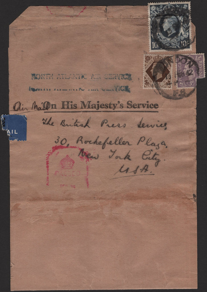1942 NEWSPAPER WRAPPER LONDON TO NEW YORK WITH 3D PALE VIOLET, 1S BISTRE-BROWN AND 10S DARK BLUE (SG478). 1942 newspaper wrapper sent 'On His Majesty's Service' air mail from London to 'The British Press Service, 30 Rockefeller Plaza, New York City, USA' with 3d pale violet (SG490) damaged, 1s bistre-brown (SG475) and 10s dark blue (SG478) crease affects with 'LONDON' cancellations 13 FE 1942. Faults but a RARE USAGE paying the air mail letter rate for newspapers of 4-4½ozs by 'NORTH ATLANTIC AIR SERVICE'. (Ref 141217).