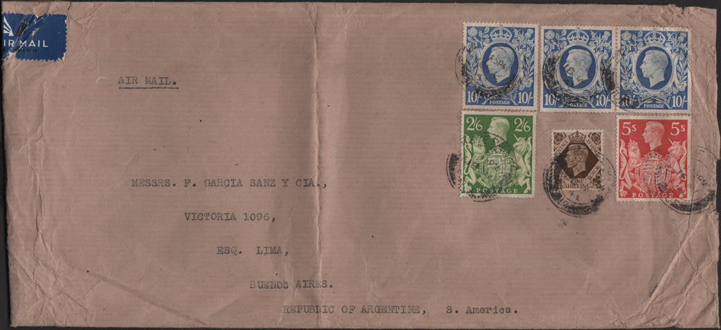 1943 LARGE ENVELOPE AIR MAIL LIVERPOOL TO ARGENTINA WITH KGVI 1S BISTRE-BROWN, 2/6 YELLOW-GREEN (SG476b), 5S RED (SG477) AND 10S ULTRAMARINE (SG478b) X 3. Large envelope, 305 x 128mm, sent air mail Liverpool to Argentina, some creasing largely clear of stamps with 1s bistre-brown (SG475), 2/6 yellow-green (SG476b), 5s red (SG477) and 10s ultramarine (SG478b) x THREE, all cancelled good strikes 'LIVERPOOL' date stamp 18 MY 43. A rare franking paying eleven times 3/6d ½oz air mail rate. (Ref 141222).